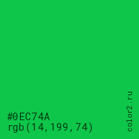 Цвет #0EC74A в цветовой модели RGB обозначается тремя октетами (14, 199, 74) в десятичном формате и #0EC74A в шестнадцатиричном (hex) формате, которые являются интенсивностью красного 14 (hex 0E), интенсивность зелёного 199 (hex C7) и интенсивность синего 74 (hex 4A).