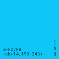 Цвет #0EC7F8 в цветовой модели RGB обозначается тремя октетами (14, 199, 248) в десятичном формате и #0EC7F8 в шестнадцатиричном (hex) формате, которые являются интенсивностью красного 14 (hex 0E), интенсивность зелёного 199 (hex C7) и интенсивность синего 248 (hex F8).