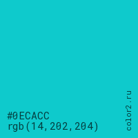 Цвет #0ECACC в цветовой модели RGB обозначается тремя октетами (14, 202, 204) в десятичном формате и #0ECACC в шестнадцатиричном (hex) формате, которые являются интенсивностью красного 14 (hex 0E), интенсивность зелёного 202 (hex CA) и интенсивность синего 204 (hex CC).