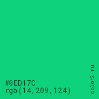 Цвет #0ED17C в цветовой модели RGB обозначается тремя октетами (14, 209, 124) в десятичном формате и #0ED17C в шестнадцатиричном (hex) формате, которые являются интенсивностью красного 14 (hex 0E), интенсивность зелёного 209 (hex D1) и интенсивность синего 124 (hex 7C).