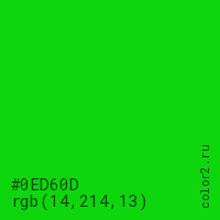 Цвет #0ED60D в цветовой модели RGB обозначается тремя октетами (14, 214, 13) в десятичном формате и #0ED60D в шестнадцатиричном (hex) формате, которые являются интенсивностью красного 14 (hex 0E), интенсивность зелёного 214 (hex D6) и интенсивность синего 13 (hex 0D).