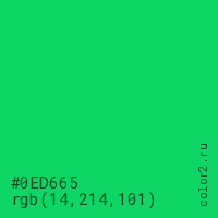 Цвет #0ED665 в цветовой модели RGB обозначается тремя октетами (14, 214, 101) в десятичном формате и #0ED665 в шестнадцатиричном (hex) формате, которые являются интенсивностью красного 14 (hex 0E), интенсивность зелёного 214 (hex D6) и интенсивность синего 101 (hex 65).