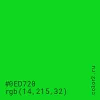 Цвет #0ED720 в цветовой модели RGB обозначается тремя октетами (14, 215, 32) в десятичном формате и #0ED720 в шестнадцатиричном (hex) формате, которые являются интенсивностью красного 14 (hex 0E), интенсивность зелёного 215 (hex D7) и интенсивность синего 32 (hex 20).