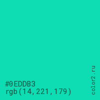 Цвет #0EDDB3 в цветовой модели RGB обозначается тремя октетами (14, 221, 179) в десятичном формате и #0EDDB3 в шестнадцатиричном (hex) формате, которые являются интенсивностью красного 14 (hex 0E), интенсивность зелёного 221 (hex DD) и интенсивность синего 179 (hex B3).