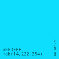 Цвет #0EDEFE в цветовой модели RGB обозначается тремя октетами (14, 222, 254) в десятичном формате и #0EDEFE в шестнадцатиричном (hex) формате, которые являются интенсивностью красного 14 (hex 0E), интенсивность зелёного 222 (hex DE) и интенсивность синего 254 (hex FE).