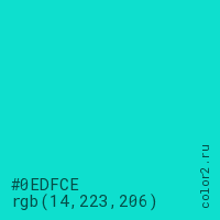 Цвет #0EDFCE в цветовой модели RGB обозначается тремя октетами (14, 223, 206) в десятичном формате и #0EDFCE в шестнадцатиричном (hex) формате, которые являются интенсивностью красного 14 (hex 0E), интенсивность зелёного 223 (hex DF) и интенсивность синего 206 (hex CE).