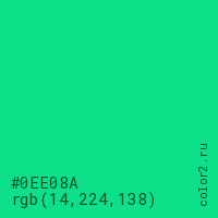 Цвет #0EE08A в цветовой модели RGB обозначается тремя октетами (14, 224, 138) в десятичном формате и #0EE08A в шестнадцатиричном (hex) формате, которые являются интенсивностью красного 14 (hex 0E), интенсивность зелёного 224 (hex E0) и интенсивность синего 138 (hex 8A).
