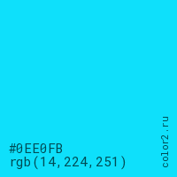 Цвет #0EE0FB в цветовой модели RGB обозначается тремя октетами (14, 224, 251) в десятичном формате и #0EE0FB в шестнадцатиричном (hex) формате, которые являются интенсивностью красного 14 (hex 0E), интенсивность зелёного 224 (hex E0) и интенсивность синего 251 (hex FB).