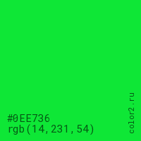 Цвет #0EE736 в цветовой модели RGB обозначается тремя октетами (14, 231, 54) в десятичном формате и #0EE736 в шестнадцатиричном (hex) формате, которые являются интенсивностью красного 14 (hex 0E), интенсивность зелёного 231 (hex E7) и интенсивность синего 54 (hex 36).