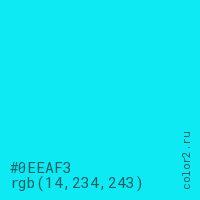 Цвет #0EEAF3 в цветовой модели RGB обозначается тремя октетами (14, 234, 243) в десятичном формате и #0EEAF3 в шестнадцатиричном (hex) формате, которые являются интенсивностью красного 14 (hex 0E), интенсивность зелёного 234 (hex EA) и интенсивность синего 243 (hex F3).