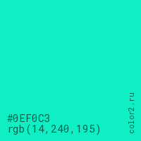 Цвет #0EF0C3 в цветовой модели RGB обозначается тремя октетами (14, 240, 195) в десятичном формате и #0EF0C3 в шестнадцатиричном (hex) формате, которые являются интенсивностью красного 14 (hex 0E), интенсивность зелёного 240 (hex F0) и интенсивность синего 195 (hex C3).