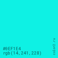 Цвет #0EF1E4 в цветовой модели RGB обозначается тремя октетами (14, 241, 228) в десятичном формате и #0EF1E4 в шестнадцатиричном (hex) формате, которые являются интенсивностью красного 14 (hex 0E), интенсивность зелёного 241 (hex F1) и интенсивность синего 228 (hex E4).