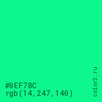 Цвет #0EF78C в цветовой модели RGB обозначается тремя октетами (14, 247, 140) в десятичном формате и #0EF78C в шестнадцатиричном (hex) формате, которые являются интенсивностью красного 14 (hex 0E), интенсивность зелёного 247 (hex F7) и интенсивность синего 140 (hex 8C).