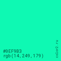 Цвет #0EF9B3 в цветовой модели RGB обозначается тремя октетами (14, 249, 179) в десятичном формате и #0EF9B3 в шестнадцатиричном (hex) формате, которые являются интенсивностью красного 14 (hex 0E), интенсивность зелёного 249 (hex F9) и интенсивность синего 179 (hex B3).