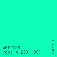 Цвет #0EFDB9 в цветовой модели RGB обозначается тремя октетами (14, 253, 185) в десятичном формате и #0EFDB9 в шестнадцатиричном (hex) формате, которые являются интенсивностью красного 14 (hex 0E), интенсивность зелёного 253 (hex FD) и интенсивность синего 185 (hex B9).
