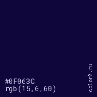 Цвет #0F063C в цветовой модели RGB обозначается тремя октетами (15, 6, 60) в десятичном формате и #0F063C в шестнадцатиричном (hex) формате, которые являются интенсивностью красного 15 (hex 0F), интенсивность зелёного 6 (hex 06) и интенсивность синего 60 (hex 3C).