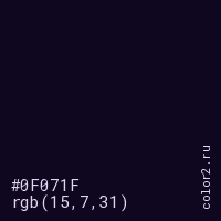 Цвет #0F071F в цветовой модели RGB обозначается тремя октетами (15, 7, 31) в десятичном формате и #0F071F в шестнадцатиричном (hex) формате, которые являются интенсивностью красного 15 (hex 0F), интенсивность зелёного 7 (hex 07) и интенсивность синего 31 (hex 1F).