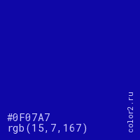 Цвет #0F07A7 в цветовой модели RGB обозначается тремя октетами (15, 7, 167) в десятичном формате и #0F07A7 в шестнадцатиричном (hex) формате, которые являются интенсивностью красного 15 (hex 0F), интенсивность зелёного 7 (hex 07) и интенсивность синего 167 (hex A7).