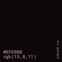 Цвет #0F080B в цветовой модели RGB обозначается тремя октетами (15, 8, 11) в десятичном формате и #0F080B в шестнадцатиричном (hex) формате, которые являются интенсивностью красного 15 (hex 0F), интенсивность зелёного 8 (hex 08) и интенсивность синего 11 (hex 0B).