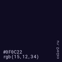 Цвет #0F0C22 в цветовой модели RGB обозначается тремя октетами (15, 12, 34) в десятичном формате и #0F0C22 в шестнадцатиричном (hex) формате, которые являются интенсивностью красного 15 (hex 0F), интенсивность зелёного 12 (hex 0C) и интенсивность синего 34 (hex 22).