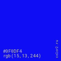Цвет #0F0DF4 в цветовой модели RGB обозначается тремя октетами (15, 13, 244) в десятичном формате и #0F0DF4 в шестнадцатиричном (hex) формате, которые являются интенсивностью красного 15 (hex 0F), интенсивность зелёного 13 (hex 0D) и интенсивность синего 244 (hex F4).