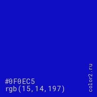 Цвет #0F0EC5 в цветовой модели RGB обозначается тремя октетами (15, 14, 197) в десятичном формате и #0F0EC5 в шестнадцатиричном (hex) формате, которые являются интенсивностью красного 15 (hex 0F), интенсивность зелёного 14 (hex 0E) и интенсивность синего 197 (hex C5).