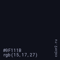 Цвет #0F111B в цветовой модели RGB обозначается тремя октетами (15, 17, 27) в десятичном формате и #0F111B в шестнадцатиричном (hex) формате, которые являются интенсивностью красного 15 (hex 0F), интенсивность зелёного 17 (hex 11) и интенсивность синего 27 (hex 1B).