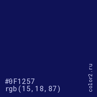 Цвет #0F1257 в цветовой модели RGB обозначается тремя октетами (15, 18, 87) в десятичном формате и #0F1257 в шестнадцатиричном (hex) формате, которые являются интенсивностью красного 15 (hex 0F), интенсивность зелёного 18 (hex 12) и интенсивность синего 87 (hex 57).