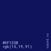 Цвет #0F135B в цветовой модели RGB обозначается тремя октетами (15, 19, 91) в десятичном формате и #0F135B в шестнадцатиричном (hex) формате, которые являются интенсивностью красного 15 (hex 0F), интенсивность зелёного 19 (hex 13) и интенсивность синего 91 (hex 5B).