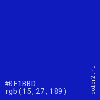 Цвет #0F1BBD в цветовой модели RGB обозначается тремя октетами (15, 27, 189) в десятичном формате и #0F1BBD в шестнадцатиричном (hex) формате, которые являются интенсивностью красного 15 (hex 0F), интенсивность зелёного 27 (hex 1B) и интенсивность синего 189 (hex BD).
