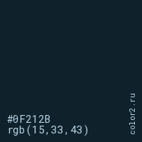 Цвет #0F212B в цветовой модели RGB обозначается тремя октетами (15, 33, 43) в десятичном формате и #0F212B в шестнадцатиричном (hex) формате, которые являются интенсивностью красного 15 (hex 0F), интенсивность зелёного 33 (hex 21) и интенсивность синего 43 (hex 2B).