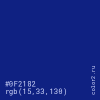 Цвет #0F2182 в цветовой модели RGB обозначается тремя октетами (15, 33, 130) в десятичном формате и #0F2182 в шестнадцатиричном (hex) формате, которые являются интенсивностью красного 15 (hex 0F), интенсивность зелёного 33 (hex 21) и интенсивность синего 130 (hex 82).