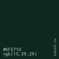 Цвет #0F271D в цветовой модели RGB обозначается тремя октетами (15, 39, 29) в десятичном формате и #0F271D в шестнадцатиричном (hex) формате, которые являются интенсивностью красного 15 (hex 0F), интенсивность зелёного 39 (hex 27) и интенсивность синего 29 (hex 1D).