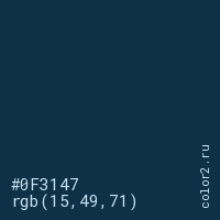 Цвет #0F3147 в цветовой модели RGB обозначается тремя октетами (15, 49, 71) в десятичном формате и #0F3147 в шестнадцатиричном (hex) формате, которые являются интенсивностью красного 15 (hex 0F), интенсивность зелёного 49 (hex 31) и интенсивность синего 71 (hex 47).