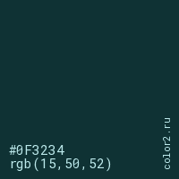 Цвет #0F3234 в цветовой модели RGB обозначается тремя октетами (15, 50, 52) в десятичном формате и #0F3234 в шестнадцатиричном (hex) формате, которые являются интенсивностью красного 15 (hex 0F), интенсивность зелёного 50 (hex 32) и интенсивность синего 52 (hex 34).