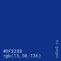 Цвет #0F3288 в цветовой модели RGB обозначается тремя октетами (15, 50, 136) в десятичном формате и #0F3288 в шестнадцатиричном (hex) формате, которые являются интенсивностью красного 15 (hex 0F), интенсивность зелёного 50 (hex 32) и интенсивность синего 136 (hex 88).