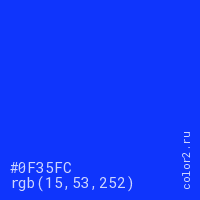Цвет #0F35FC в цветовой модели RGB обозначается тремя октетами (15, 53, 252) в десятичном формате и #0F35FC в шестнадцатиричном (hex) формате, которые являются интенсивностью красного 15 (hex 0F), интенсивность зелёного 53 (hex 35) и интенсивность синего 252 (hex FC).