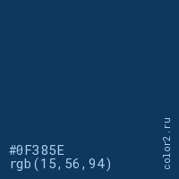 Цвет #0F385E в цветовой модели RGB обозначается тремя октетами (15, 56, 94) в десятичном формате и #0F385E в шестнадцатиричном (hex) формате, которые являются интенсивностью красного 15 (hex 0F), интенсивность зелёного 56 (hex 38) и интенсивность синего 94 (hex 5E).