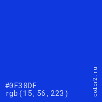 Цвет #0F38DF в цветовой модели RGB обозначается тремя октетами (15, 56, 223) в десятичном формате и #0F38DF в шестнадцатиричном (hex) формате, которые являются интенсивностью красного 15 (hex 0F), интенсивность зелёного 56 (hex 38) и интенсивность синего 223 (hex DF).