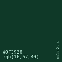 Цвет #0F3928 в цветовой модели RGB обозначается тремя октетами (15, 57, 40) в десятичном формате и #0F3928 в шестнадцатиричном (hex) формате, которые являются интенсивностью красного 15 (hex 0F), интенсивность зелёного 57 (hex 39) и интенсивность синего 40 (hex 28).