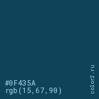 Цвет #0F435A в цветовой модели RGB обозначается тремя октетами (15, 67, 90) в десятичном формате и #0F435A в шестнадцатиричном (hex) формате, которые являются интенсивностью красного 15 (hex 0F), интенсивность зелёного 67 (hex 43) и интенсивность синего 90 (hex 5A).