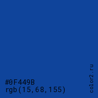 Цвет #0F449B в цветовой модели RGB обозначается тремя октетами (15, 68, 155) в десятичном формате и #0F449B в шестнадцатиричном (hex) формате, которые являются интенсивностью красного 15 (hex 0F), интенсивность зелёного 68 (hex 44) и интенсивность синего 155 (hex 9B).