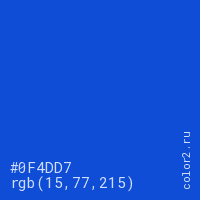 Цвет #0F4DD7 в цветовой модели RGB обозначается тремя октетами (15, 77, 215) в десятичном формате и #0F4DD7 в шестнадцатиричном (hex) формате, которые являются интенсивностью красного 15 (hex 0F), интенсивность зелёного 77 (hex 4D) и интенсивность синего 215 (hex D7).