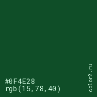Цвет #0F4E28 в цветовой модели RGB обозначается тремя октетами (15, 78, 40) в десятичном формате и #0F4E28 в шестнадцатиричном (hex) формате, которые являются интенсивностью красного 15 (hex 0F), интенсивность зелёного 78 (hex 4E) и интенсивность синего 40 (hex 28).