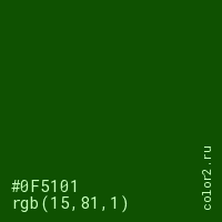 Цвет #0F5101 в цветовой модели RGB обозначается тремя октетами (15, 81, 1) в десятичном формате и #0F5101 в шестнадцатиричном (hex) формате, которые являются интенсивностью красного 15 (hex 0F), интенсивность зелёного 81 (hex 51) и интенсивность синего 1 (hex 01).
