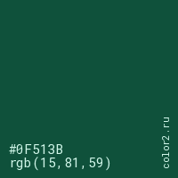 Цвет #0F513B в цветовой модели RGB обозначается тремя октетами (15, 81, 59) в десятичном формате и #0F513B в шестнадцатиричном (hex) формате, которые являются интенсивностью красного 15 (hex 0F), интенсивность зелёного 81 (hex 51) и интенсивность синего 59 (hex 3B).