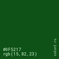 Цвет #0F5217 в цветовой модели RGB обозначается тремя октетами (15, 82, 23) в десятичном формате и #0F5217 в шестнадцатиричном (hex) формате, которые являются интенсивностью красного 15 (hex 0F), интенсивность зелёного 82 (hex 52) и интенсивность синего 23 (hex 17).