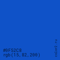 Цвет #0F52C8 в цветовой модели RGB обозначается тремя октетами (15, 82, 200) в десятичном формате и #0F52C8 в шестнадцатиричном (hex) формате, которые являются интенсивностью красного 15 (hex 0F), интенсивность зелёного 82 (hex 52) и интенсивность синего 200 (hex C8).