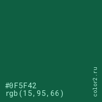 Цвет #0F5F42 в цветовой модели RGB обозначается тремя октетами (15, 95, 66) в десятичном формате и #0F5F42 в шестнадцатиричном (hex) формате, которые являются интенсивностью красного 15 (hex 0F), интенсивность зелёного 95 (hex 5F) и интенсивность синего 66 (hex 42).