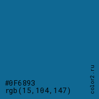 Цвет #0F6893 в цветовой модели RGB обозначается тремя октетами (15, 104, 147) в десятичном формате и #0F6893 в шестнадцатиричном (hex) формате, которые являются интенсивностью красного 15 (hex 0F), интенсивность зелёного 104 (hex 68) и интенсивность синего 147 (hex 93).